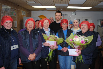 Shellfish processors Irene Blake, who has been with the Buckie company for 27 years, and Anne Duthie for 25 years, were presented with flowers and a cheque each by Grant Eckersley, sales director for Moray Seafoods.