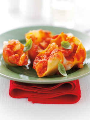 Drain the pasta well and with a teaspoon, spoon the tomato and prawn mix into the shells before placing in an oven proof dish. Pour the rest of the sauce on top of the shells and sprinkle with the remaining mozzarella. Grill for 5 - 7 minutes or until the mozzarella is golden brown.