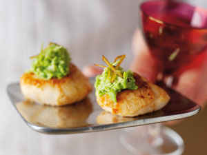 Serve the scallops topped with the minted pea and garnished with the shredded spring onion.